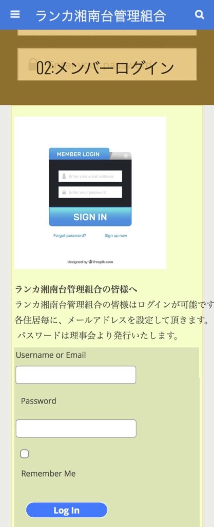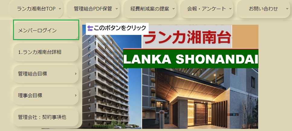 通常確認して頂きたいところは投稿部分 になります:本来、理事会の場所を確認 する様に作りました。一応理事会用に記 載している場所もありますが、現理事会 には一々説明する事も無い状況ですので 踏み込んだ説明や意見を記載しているこ の18)投稿・アンケートを直接ご確認 して頂きたいと思います。 但し、一般の方に見る事が出来ない様に パスワードとログインを入力する必要が 有ります: ランカ湘南台ホームページ詳細説明: パソコン用とスマホ用で画面表示が違 います。ログイン方法を分けて解説し ます。 ログイン方法:PCパソコン用 1)初めに理事会へ登録メールアドレス を提出して頂きます: 2)その後理事会より、各組合員の方に向 けてパスワードを発行させていただきます。 3)画面2パターン記載します ※PC利用:画面上部「メンバーログイン」 をクリック
