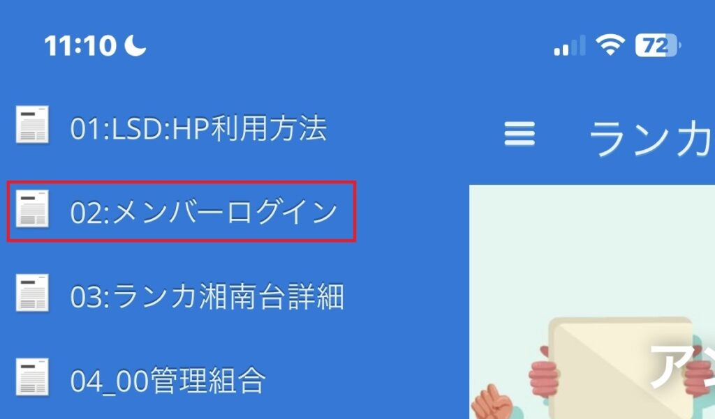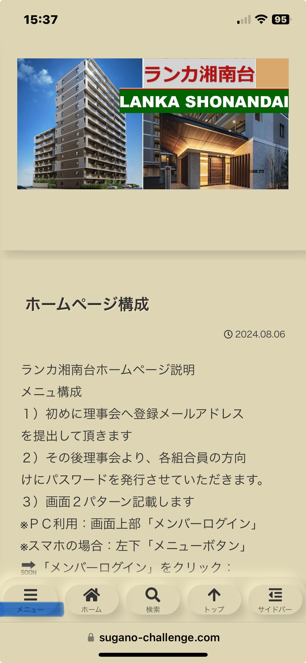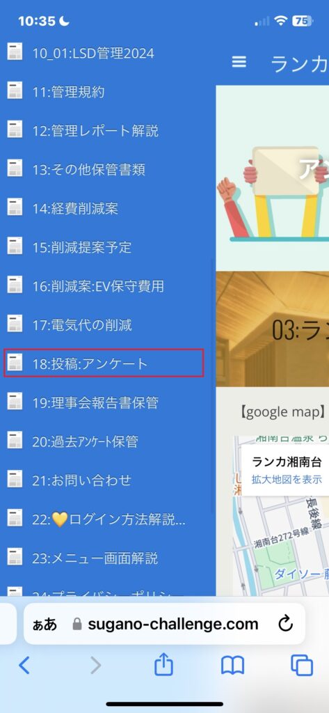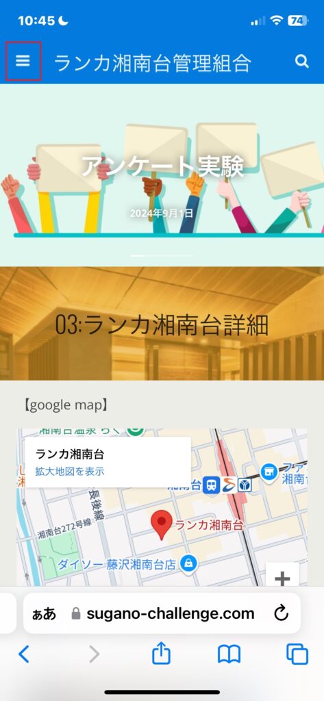 ランカ湘南台HPログイン方法です 最初に: スマホをご利用の場合はスマホ専用設定 にしてご覧ください: GoogleChrome若しくはSafariで 「ランカ湘南台管理組合」を検索します この画面がトップ画面です: メニューの表示は赤色のハンバーガーボタンアンケート実験と書いてあるのは投稿が表示 当時の最新投稿が「アンケート実験」です。 多分最大で最新の投稿が5件が表示可能。 通常メニューはハンバーガーボタン操作です 左上の赤文字で囲ったところ: クリックすると⇓このメニューが出ます: